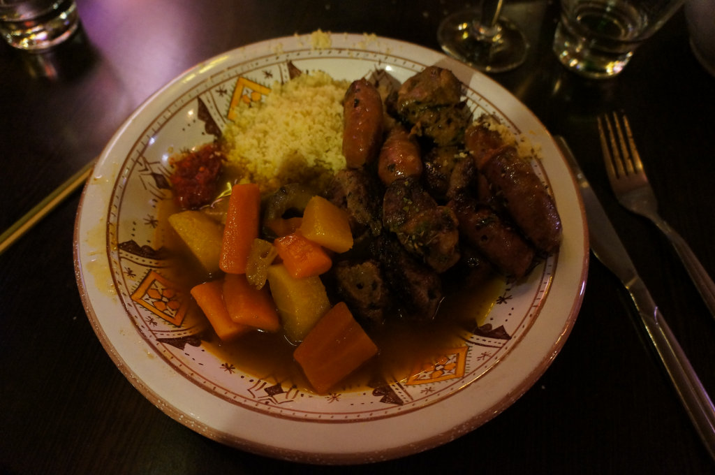 Anyway, I feel the best cure for my rather sickly stomach is more food. What could possibly go wrong. We head out to Le Marrakech our favourite Moroccan restaurant that we have been visiting on and off for the best part of 14 years. Our nostalgia filled memories are taken up with steaming bowls of vegetable stew, huge portions of couscous and sizzling plates of grilled meat, rounded off with the jingle jangle of the waitresses skirts and a glass or three of vin rouge.