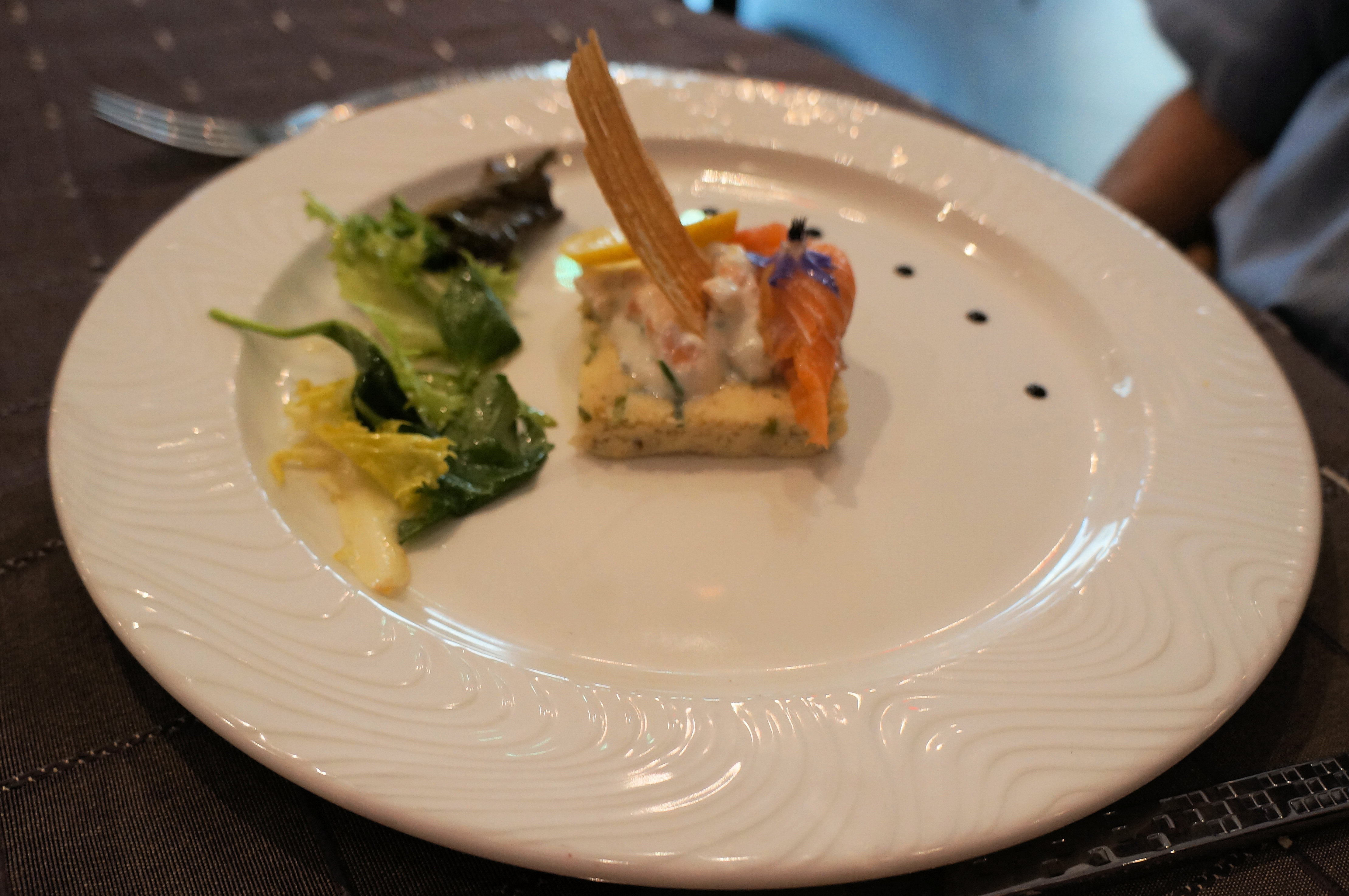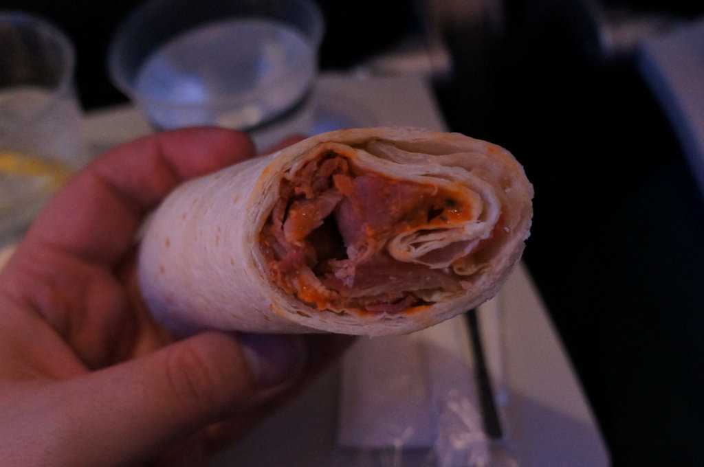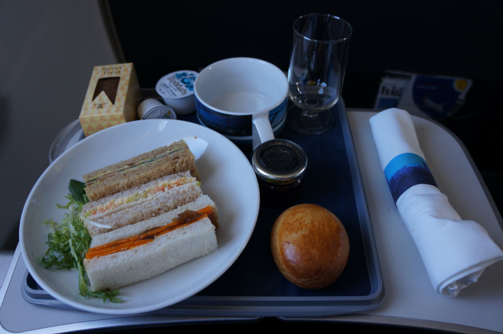Anne-So asked to switch to 1F as it turned out we had the entire row 1 to ourselves as Club was only 4/16 that day. Take off always feels lonely without Anne-So at my side and that day was no different. After a slow get away we were soon airborne. The clouds over Heathrow felt rather menacing as we launched in to those London skies. Once we hit cruise the FA came up to me with a tray and enquired, “Afternoon tea?” I had expected nuts and a drink first. Oh well… The drinks came but the nuts were absent. It wasn’t like I was feeling overly optimistic about clearing my tray but it would have been nice to have nuts with my drink!
