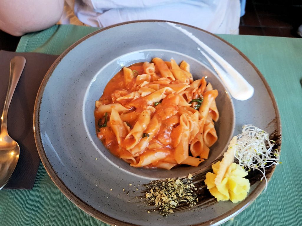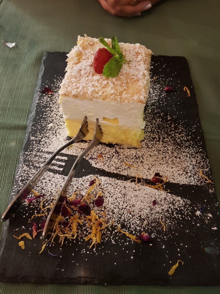 After a good rest it was dinner time! Our first attempt was Penzion Berc (Sounds so funny in French, but what the heck), it looked good and was right next to our hotel but we failed as it was all booked up for the night. In the end we followed that Bled Blog and our instincts and ended up at Restaurant Babji zob near the lake. I have to say it was a pretty decent choice and we were lucky to get a table almost straight away. The service was friendly though 100% on holiday time (perhaps they were a person short, at least that was how it felt). We started with a delicious bottle of Slovenian white wine, perfect as a cooler on any summers day. Not feeling massively hungry we skipped starters. I chose the “Chicken Breasts Wrapped In Prosciutto, Filled with Spinach, Dried Tomato and Feta Cheese with Spiced Roasted Potatoes” and Anne-So picked the “FuŽi with Smoked Salmon and Smoked Cheese”. Both portions were humongous and beautifully presented. This was definitely better than your average trap by the lake, it was a perfect summer holiday meal. Somehow we cleared our plates and of course no trip to Bled is complete without a slice of that famous cream cake. Although the photo doesn’t quite do it justice the portion was easily big enough for two. It was a good job we shared!
