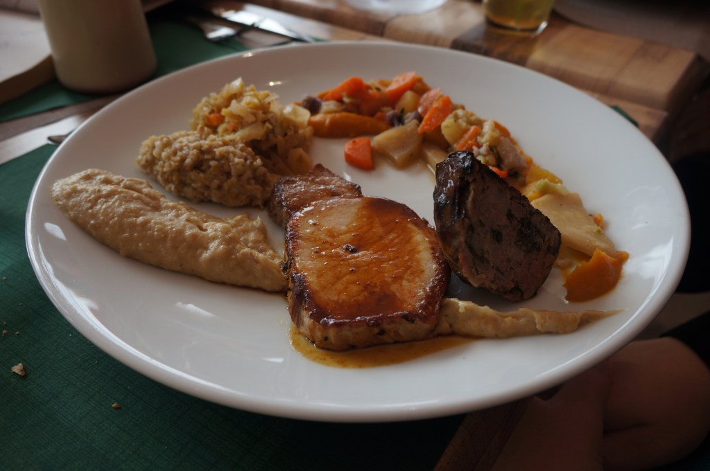 Our mains came a little while later, and with the size of the portions we were glad of the pause. We split evenly between the veal, fish and pork. I choose the pork but the sous vide veal looked very interesting, my chop was just moist, perfectly seasoned with a small thick sauce. The caillette was soft, packed with flavour and just the right balance of herbs and garlic. The vegetables were cooked perfectly adding bite and texture. The carrot puree was rich beyond belief and the cep infused mash gave a bit of earthiness to the plate. In all it was delicious, my plate was clean afterwards.