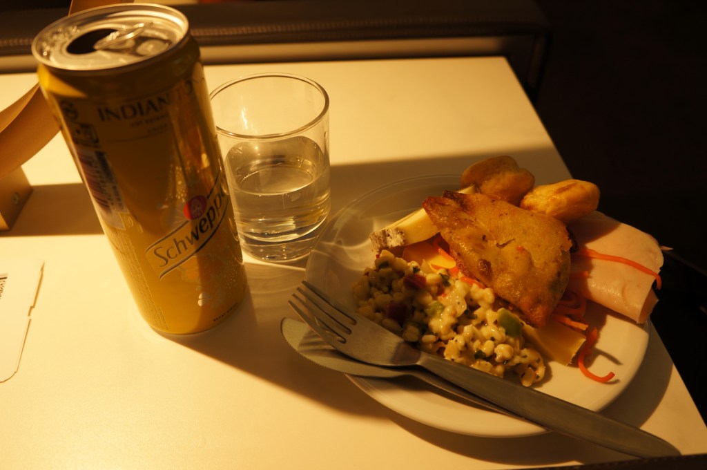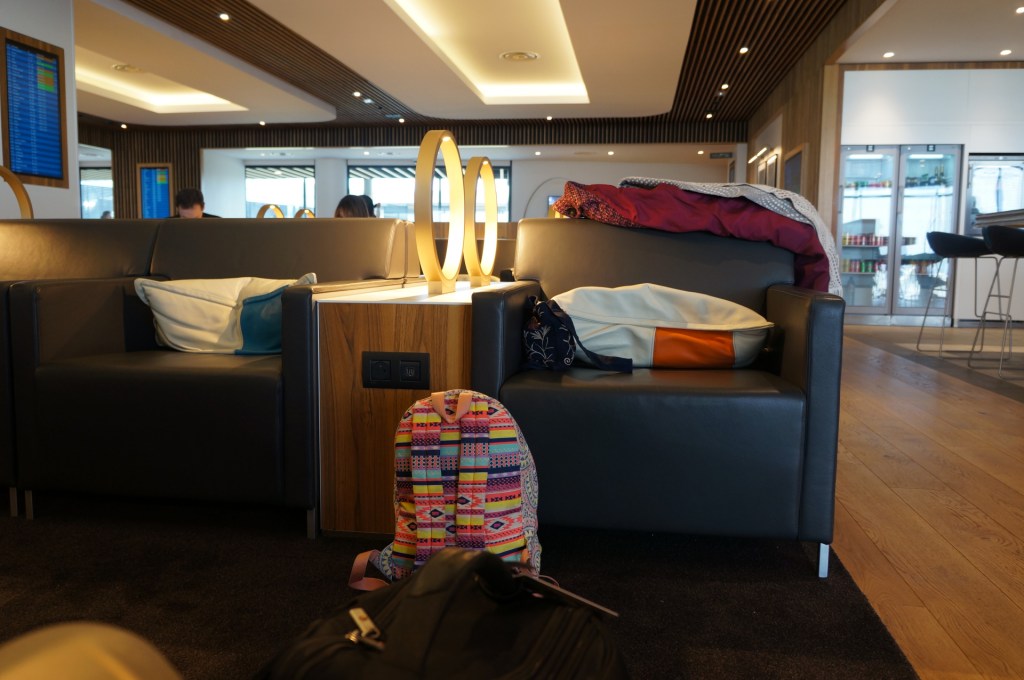 We’re currently sat in the Salon Mont Blanc Lounge, which looks like a cross between a ski lodge (complete with what I will incorrectly dub its own ring of fire) and a fancy hospital waiting room. I mixed myself an obscenely large gin and tonic and got pretty pissed as the glasses were dishwasher warm which wasn’t great for a refreshing cold drink (mentally refreshing that is before you ask). The food here has also improved from our last visit from downright disgusting to barely edible. I ‘enjoyed’ some freshly microwaved pizza and samosas (yes, samosas in a French airline lounge!). At least I had Anne-So and the gin to keep me company.
