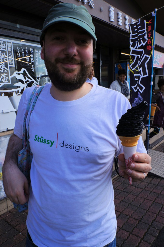 We took a little walk at the top but not for long as the smell of sulphur in the air is not the most enjoyable. There were a few food stalls and tourist shops mostly selling the famous black eggs and other assorted items. As the black eggs came only in large quantities and neither of us were in the mood for what too many eggs can do to you, we passed. Instead I opted for a quick snack of fried rice balls and some black ice cream. Not the delicious black sesame ice cream I enjoyed for lunch later in the trip, but vanilla ice cream dyed black. This mistake was unfortunately one that would last a good few days…