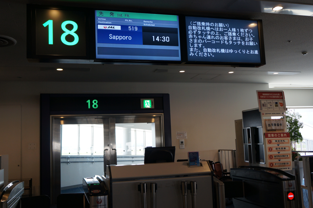 This train truly went at some speed for a commuter train and about 15 minutes later we were at the airport. We got off, recharged our Pasmos for Sapporo, attempted to work out the JAL domestic check in process and the location of the desks. HND seemed like a pretty nice airport and before long we found the desks and had someone check us in. If you are on regular JL stock as opposed to a BA reward flight you could easily print your own bag tag and self check in. We loved the attention to detail the staff had when taking care of baggage. Security was easy and it turns out liquids are fine but they need to be placed in a special scanner for checking. Thankfully Anne-So’s water bottle passed with flying colours.
