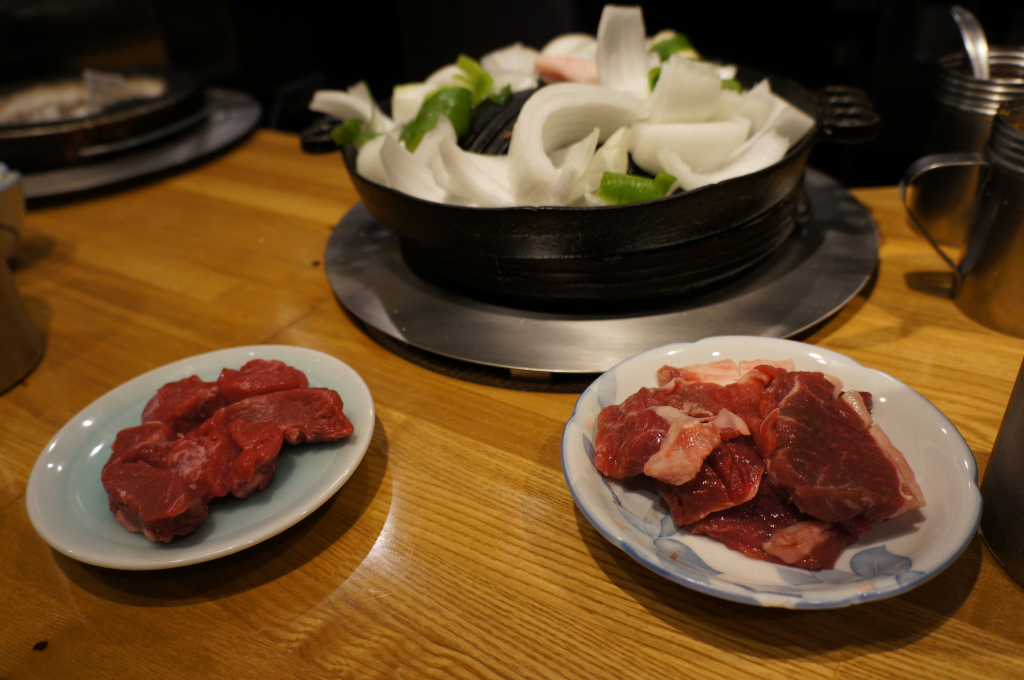 We walked back to the station and over to the bustling nightlife area for dinner. Between the bar touts, neon, love hotels and restaurants it was quite an experience. We eventually found Daruma which was recommended by our guidebook as being a great place to try Genghis Khan, which in short is cook your own lamb on a special grill along with onions, garlic, dipping sauces, kimchi and plenty of beer.