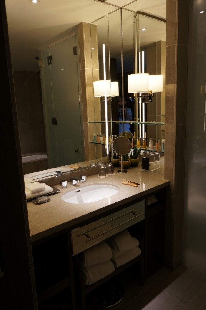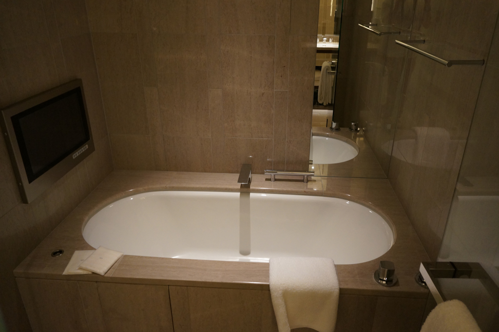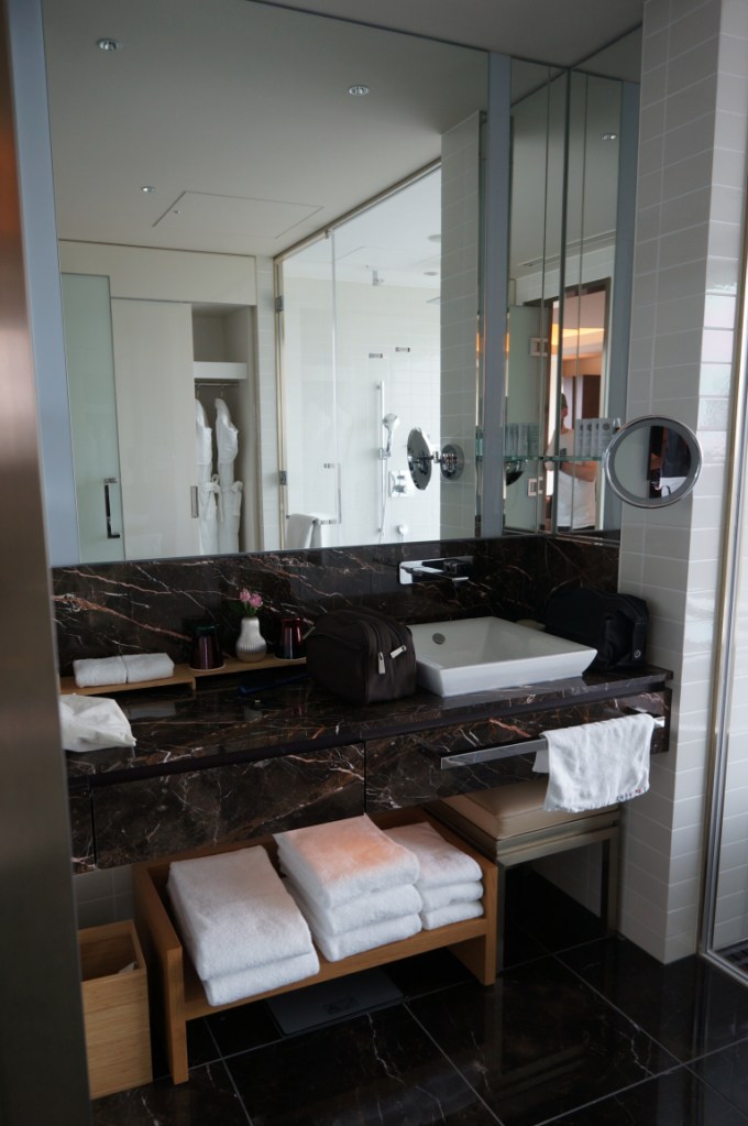 The club lounge was small and well-appointed with plenty of seating including some with the amazing city views. There was also a small food and drink area but at this hour only a small selection of snacks were out, including some rather addictive chocolates. We were soon advised that our room was ready and a few minutes later we headed off. Once again we were not disappointed. As we walked down the entry corridor the blinds were automatically rising to reveal a spectacular view of Tokyo. The room was huge and in other hotels could easily have passed for a junior suite thanks to a generous living area with lots of seating space to enjoy those wonderful views. The bathroom was well appointed, though had only one sink. Storage space in the room was also excellent. A small welcome amenity of some biscuits and Japanese sweets had been prepared for us.