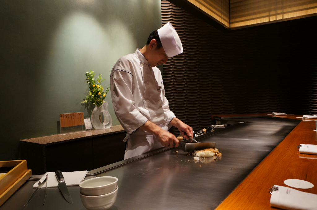 We were running a little late and made it to check in for 2pm, the same time as our reservation for lunch at Go Teppanyaki. Thankfully check in was quick and friendly with our Virtuoso benefits explained. Our bags were dragged one way and we were pulled the other as we were marched straight to the restaurant. The set up was similar to the tempura restaurant at the Ritz in Kyoto. There were two spotless grills and one other couple in the restaurant.