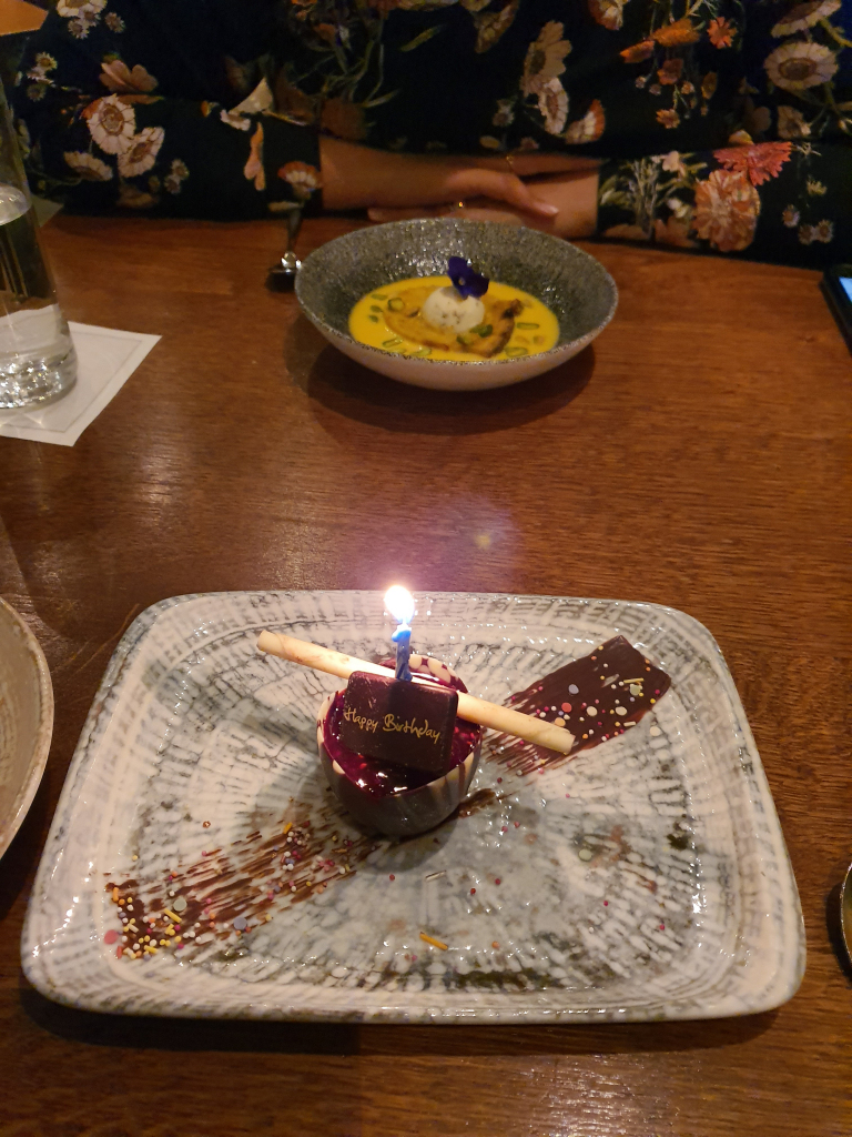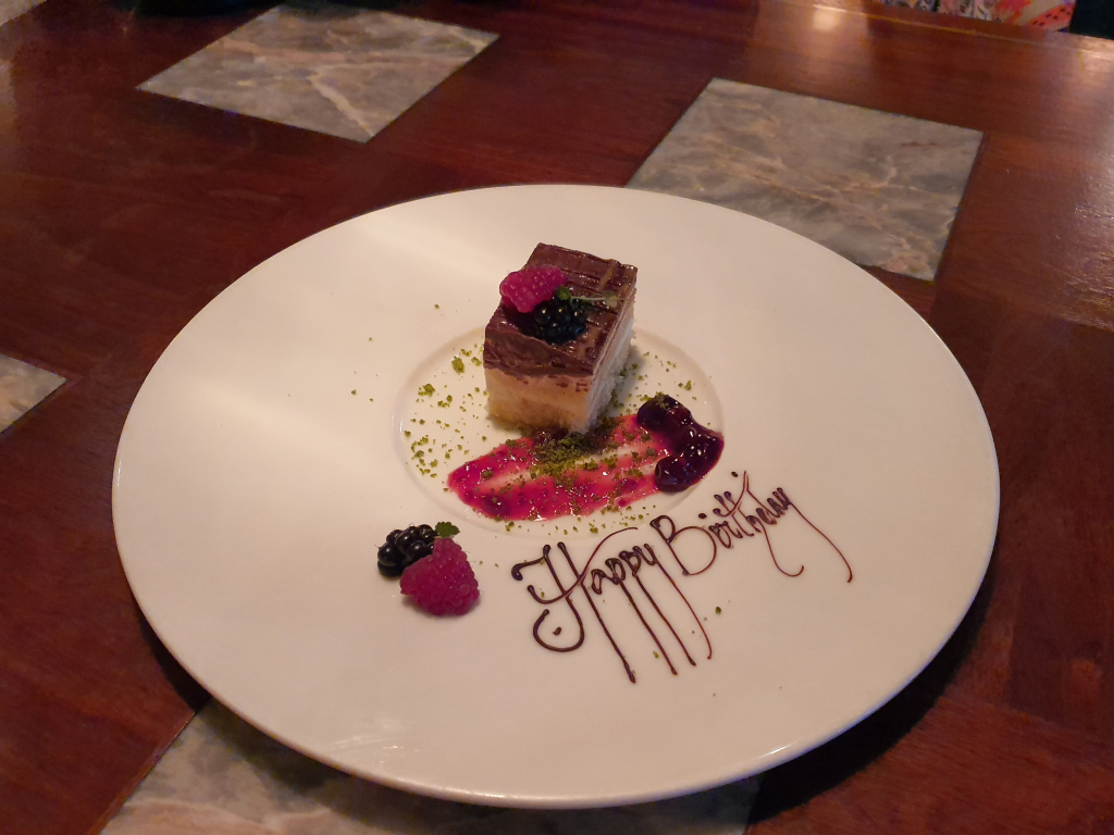 By the time we had gotten to dessert we were filled to bursting, the pacing of the meal was fine, so perhaps it was the early hour for dinner (at least for me). But our flowing conversation had turned into a fight for survival with each of us offering the other a spoon of our dessert to finish the plate and that’s before we even got to the additional slice of birthday cake!