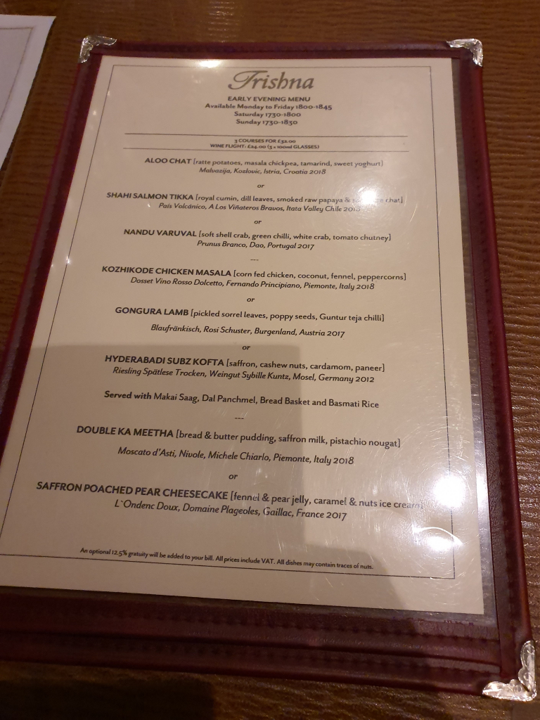 From looking at my photos you may wonder what sets Trishna apart from your run of the mill curry house. In reality it’s really simple: the impeccable fresh ingredients used in the curries, you won’t find any tough meat or canned veg here. The second thing is the spicing, all the dishes have an excellent flavour profile where you can taste all the ingredients as opposed to just getting a unforgiving uniform hit of chilli, the more you eat the more those flavours come alive in your mouth. The final thing is the service which although fairly formal is incredibly friendly and warm with every member of staff really wanting to make sure you have an excellent meal from the moment you step through the door to the moment you leave.