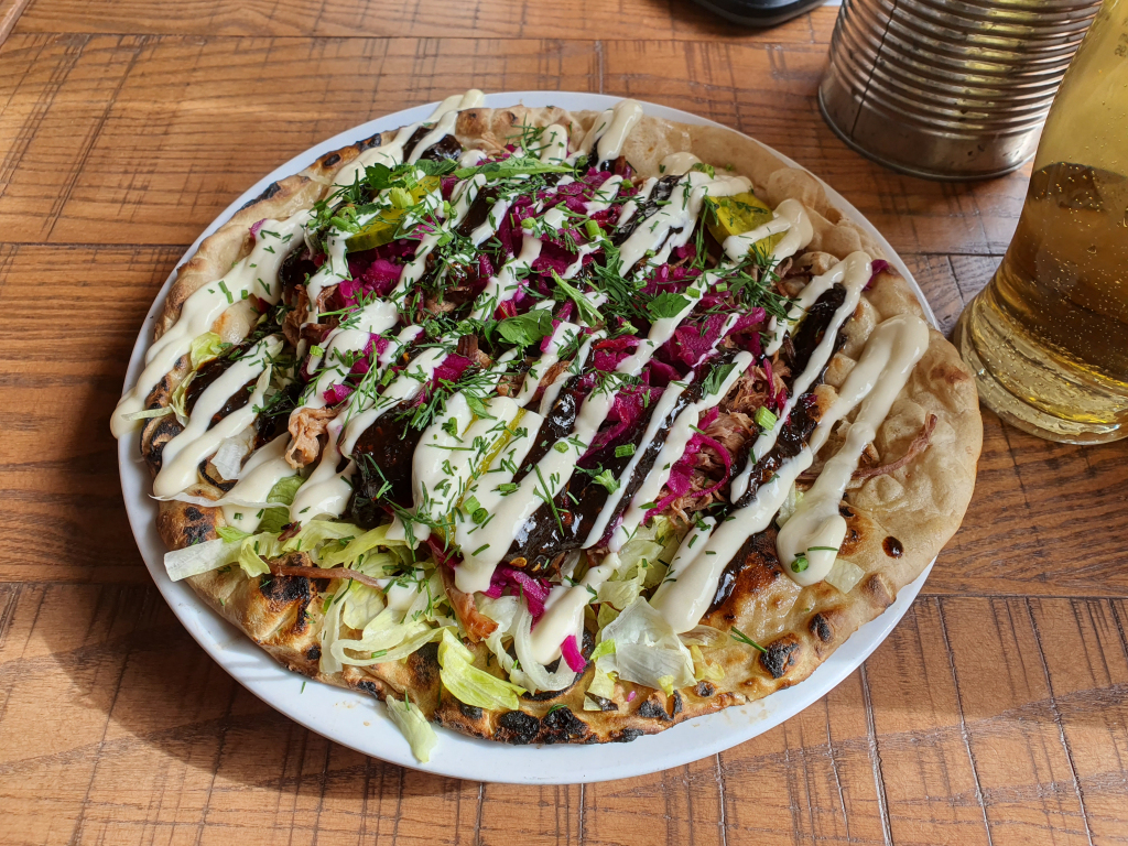 I had an outstandingly good smoked beef naan that was hot with chilli sambal, sour with pickled veg, served on a crisp, beef-fat flavoured naan topped with soft buttery smoked beef and just a hint of sweetness from the pomegranate yogurt sauce.
