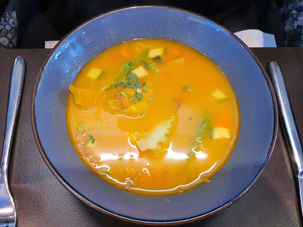 Anne-So and her dad F ordered the Thai soup, a warm orange liquid fragrant with lemongrass concealing the prawn filled wonton dumplings.