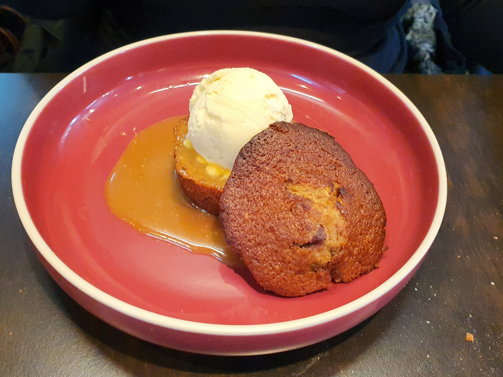 For dessert Anne-So had a sticky toffee pudding in the form of a muffin, top removed and placed to the side for convenience with a warming scoop of rum and raisin ice cream and a lake of caramel sauce.