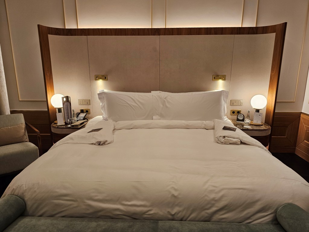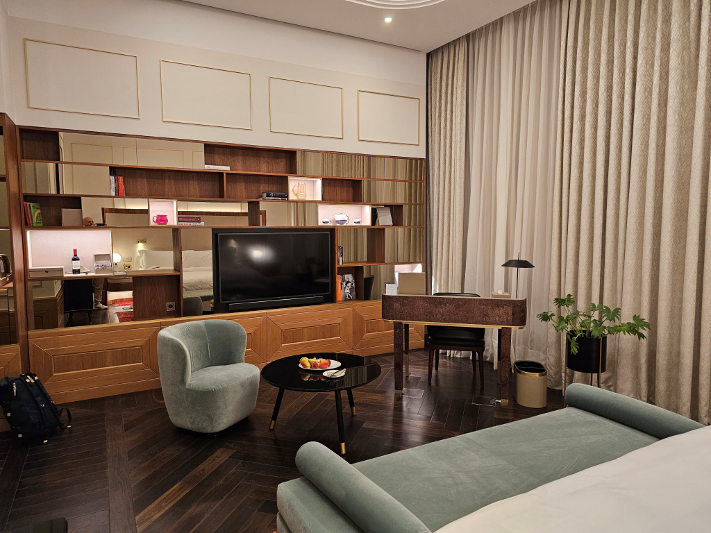 The first thing we noticed were the high ceilings, shortly followed by the sheer amount of space to move around. We’d stayed in suites with significantly less to play with than this room! The lighting was warm and bright, the furniture looked and felt luxurious, and other than trying to figure out how the light inside the desk worked, everything about the room just made us feel instantly at home.