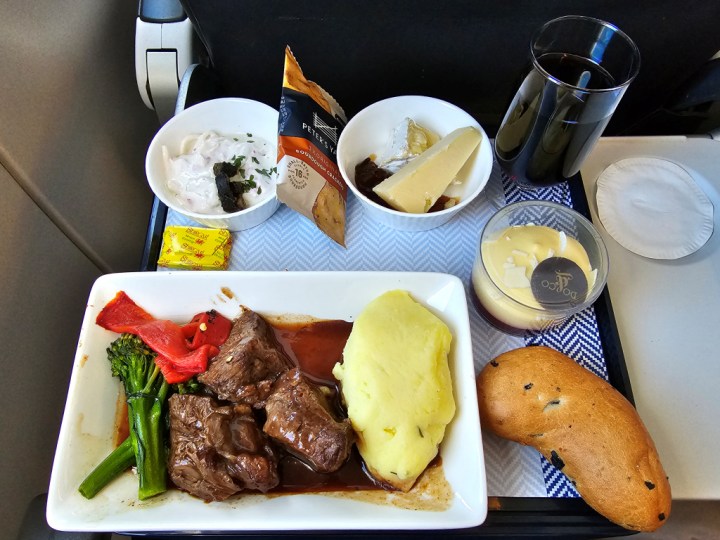 The slaw was a nice bit of cream and acid to get our palates going, the beef was relatively tender and there was a still a smattering of flavour left after their blast in the steam oven! It was just the right amount and type of meal to pass the time and fill our stomachs as we flew over a soft carpet of cloud. I also enjoyed the fig relish served with my cheese, it really hit the spot. Not wanting to test the extent of my lactose intolerance any further I handed my Cherry Trifle over to Anne-So. It was a shame there was no chocolate dessert as the BA DO&CO ones are normally quite delicious!
