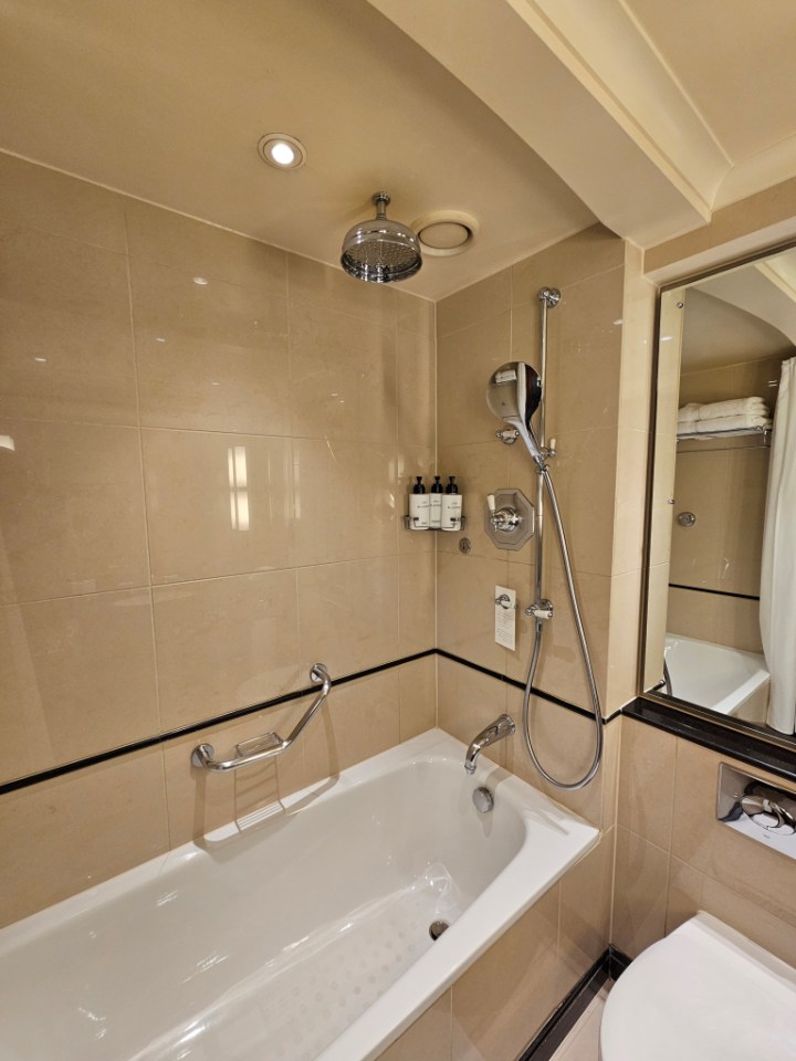 This room was at least free from external noise. However, the bathroom fan issue persisted. Again, if we’d checked in during the day or the fan had been allowed to run ahead of our arrival we’d not have noticed it much, or perhaps we’d just have been slightly annoyed that it took a while to run its cycle. Instead we were just tired and annoyed that a luxury hotel charging silly money per night couldn’t get the most fundamental thing right, a quiet and comfortable place to sleep for the night. Oh well… We stuck it out and eventually the bathroom buzz stopped. We did manage a sold seven hours of sleep in the end. The bed was comfortable, the bedding excellent and once the fan stopped the room was very quiet for a Central London location.