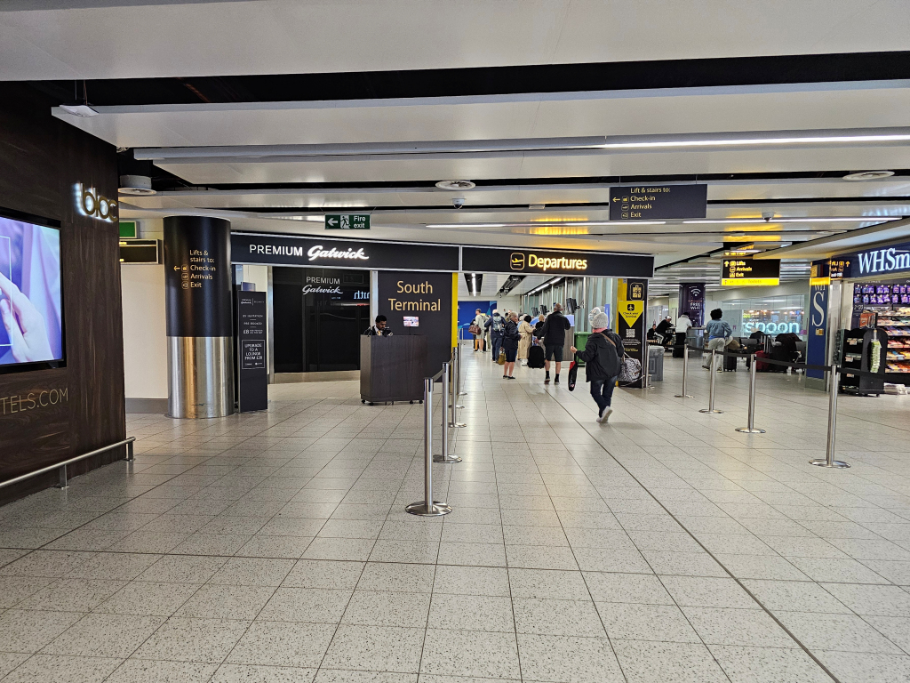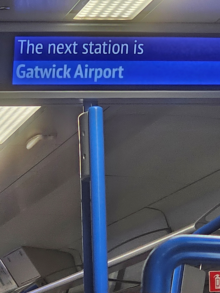 Once out of London our speed increased and before long we pulled into a very smart looking Gatwick Airport, now looking like a proper airport station with modern black and yellow signage, a significant improvement over our last visit.