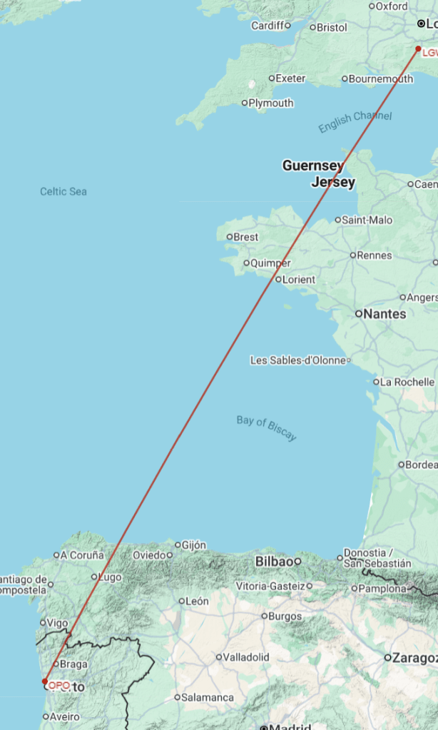 - A flight in Business Class on BA from London Gatwick to Porto
